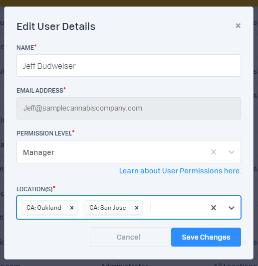 An "Edit User Details" modal will open where you can change the user's permission level and/or the location(s) the user is assigned to.